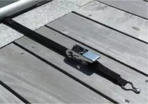 Befestigung: Seitlich verschiebbare Edelstahlratschen mit Gurt & Ring, herausziehbare Edelstahlstifte. Windsafe System (Hebeschutzgurt mit Ratsche & Ring) an jeder Längsseite)