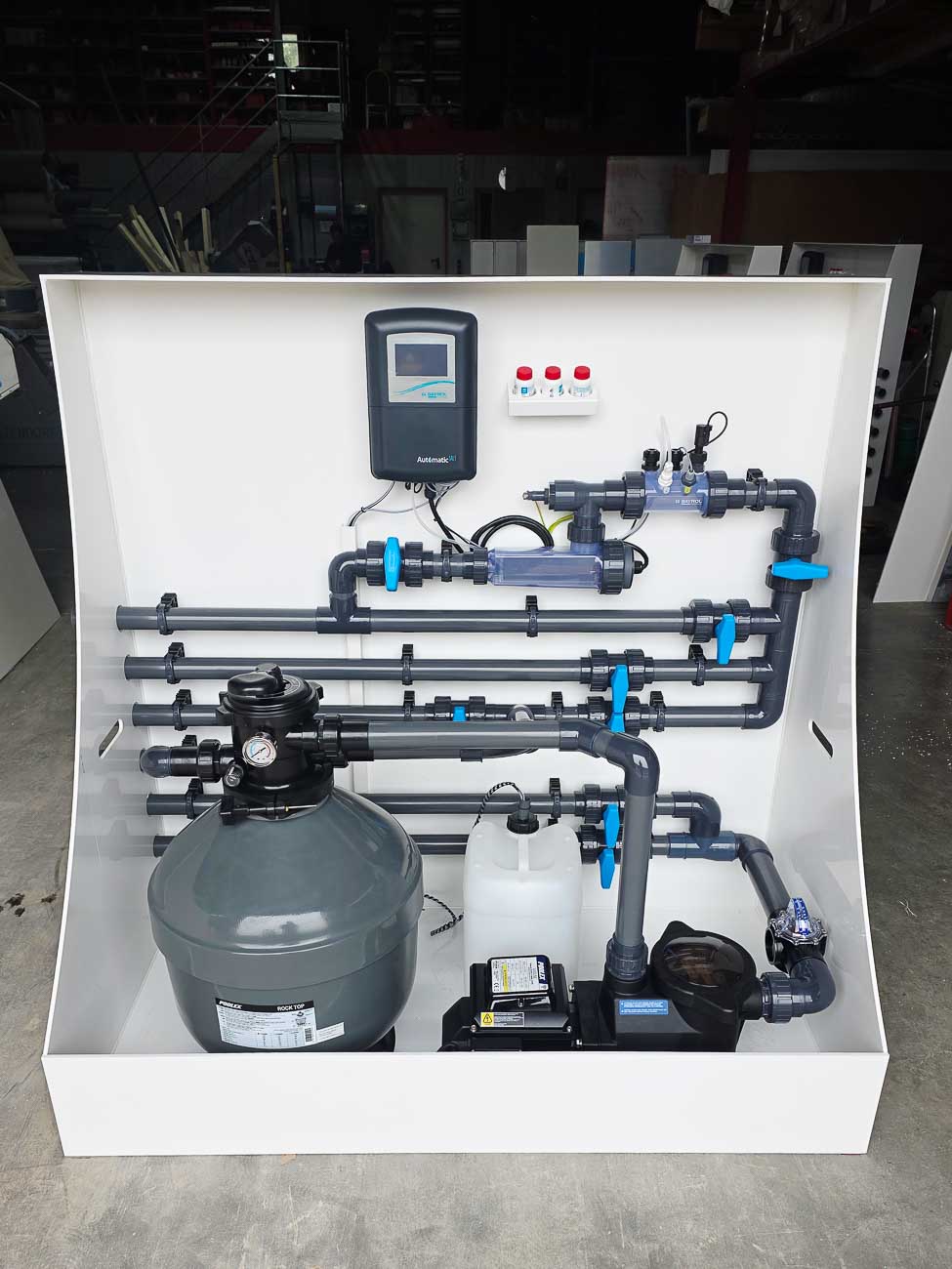Alle Komponenten sind platzsparend und optisch ansprechend in unsere eigens gefertigten Technikwand verborgen. Dies ermöglicht eine saubere Installation in Ihrer Garage, dem Gartenhaus oder ihrem Keller. Für zukünftigen Komfort ist ein Bypass-Anschluss für eine Pool-Wärmepumpe bereits werkseitig vorbereitet.